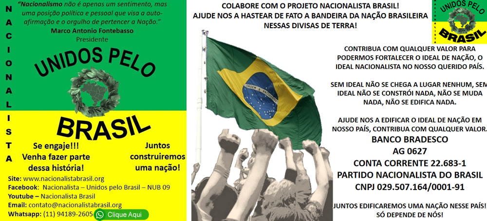 NACIONALISMO não é apenas um sentimento, mas uma posição, política e pessoal que visa à auto-afirmação e o orgulho de pertencer a Nação, ao pleno desenvolvimento da sociedade nacional, com a determinação e o empenho de todos, para uma sociedade justa, forte e ordeira. Ser nacionalista é reconhecer, a lealdade à Nação de que se é ínfima parte, mas importante parcela atuante e consciente, agregador e multiplicador. Ser nacionalista é sobrepor a quaisquer interesses outros, individuais, de facções ou de grupos, aos verdadeiros temas e interesses da nação. O autêntico nacionalismo visa o desenvolvimento da Nação, visa colocá-la em condições de promover a união mais íntima e mais justa de seu povo e não apenas o seus interesses pessoais. Ser nacionalista é ter ética, respeito a leis e a ordem publica e constitucional, cumprir suas obrigações e deveres, ter cordialidade, respeitar a autoridade e ser fiel cumpridor de suas obrigações. Faça parte desse ideal!